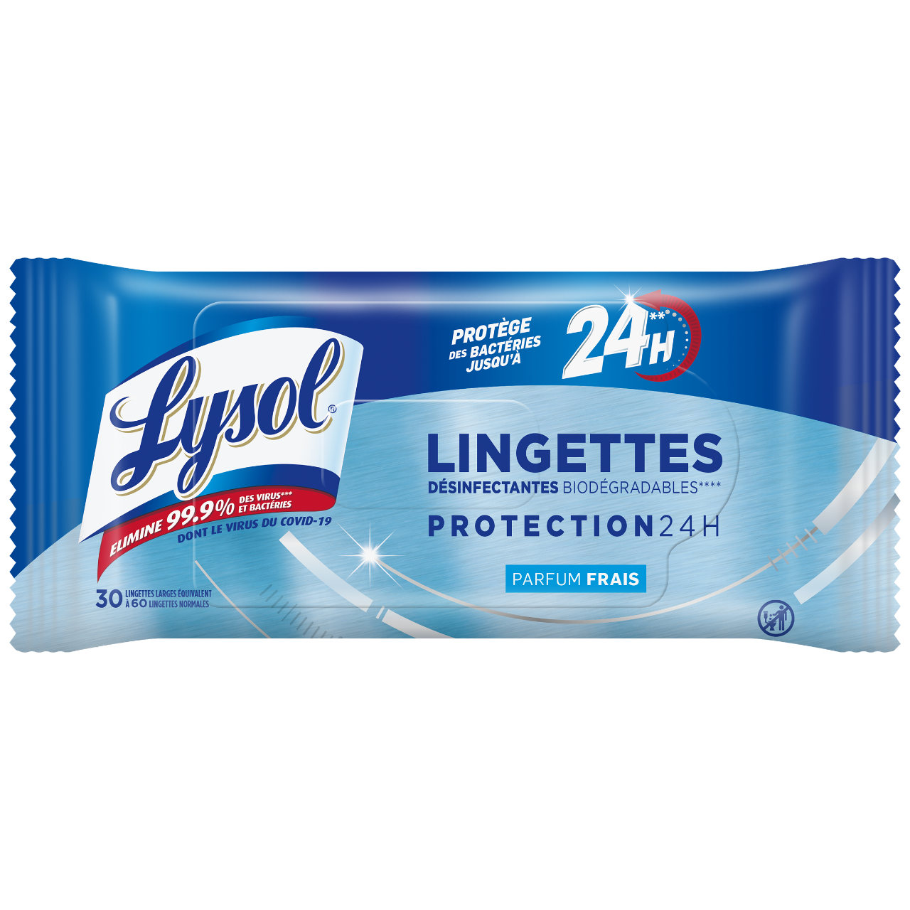 Formule sans javel et sans colorant, Eau, Chlorure de Benzalkonium CAS#68424-85-1 : 0.52g pour 100g dans la solution d’imprégnation, Ethanol, Parfum.